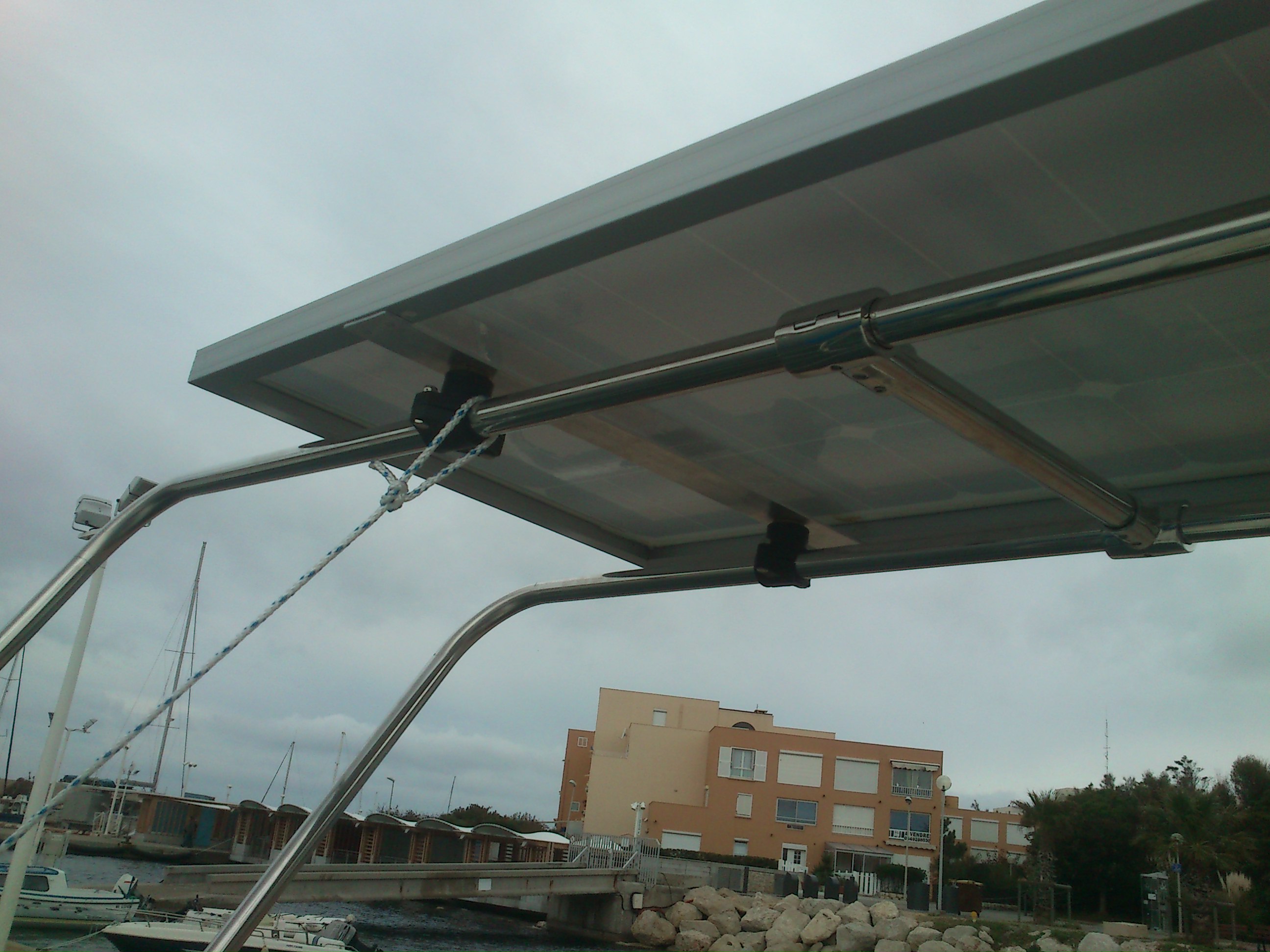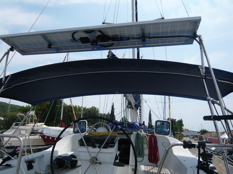 Petit retour sur mon installation : 2 panneaux de 100 W, régulateur MPPT, fixations avec « noix magiques » sur bâti inox 25 mm repris sur arceaux du bimini . Renforts latéraux pour rigidifier l’ensemble . Et voilà ! Autonomie électrique quasi totale pour quelques jours au mouillage sans bouger ni démarrer le moteur . Le panard quoi !
