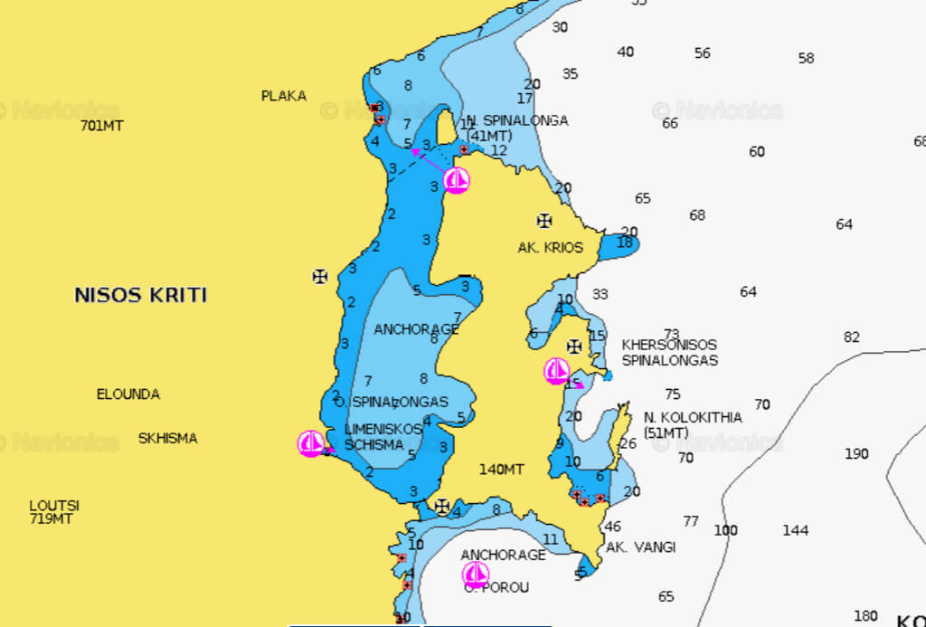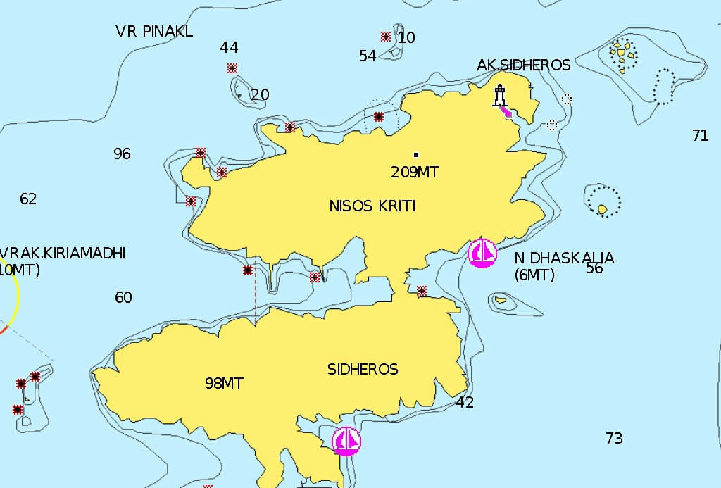 - A l’extrémité NW de la Crète, on trouve un bon mouillage forain, dans un cadre enchanteur. Attention aux haut fonds au SW de l’île.
