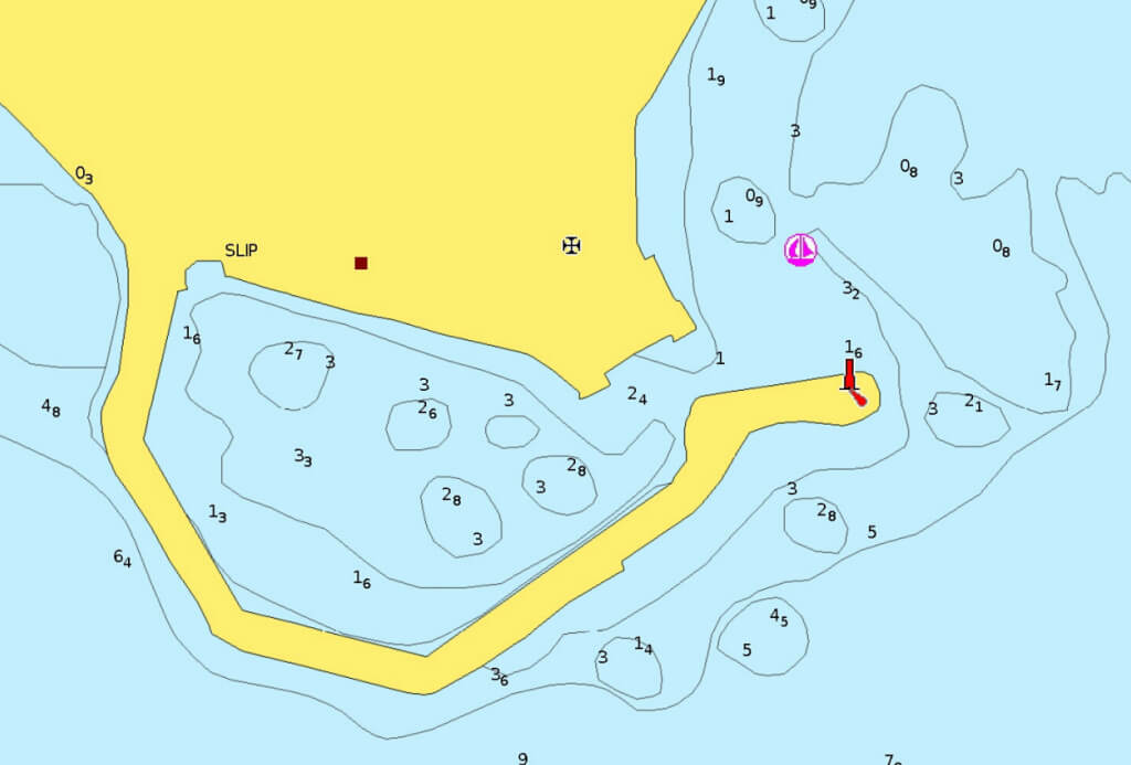 - Passe d’entrée extrêmement délicate, en serrant l’extrémité Est du môle