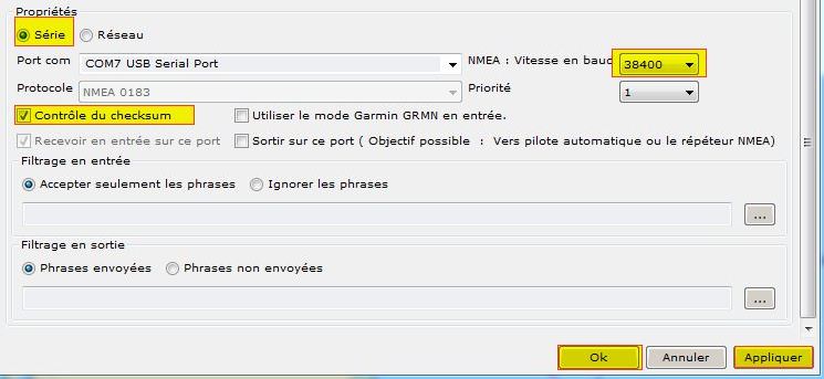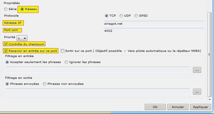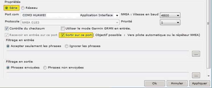 - les phrases de données NMEA en provenance ou en sortie d’OpenCPN s’affichent, permettant un contrôle de qualité de ces phrases NMEA.