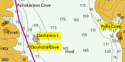 Doulicha (ou Kamini, ou Daskalio selon certains guides) : c’est la plage mythique de ce chenal, face à l’île Daskalio (d’où l’erreur typographique des guides), face aussi à l’anse O.Polis sur Ithaque. La large baie (200 x 200 m) offre une bonne protection des vents dominants (NW), mais les fonds descendent très vite. La vallée profonde, dans l’axe de la baie doit générer des rafales. Fond d’herbes et de sable tenant correctement.