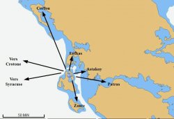 Le poète nous décrit cette manÅ“uvre aussi bien pour le vaisseau qui ramenait Télémaque de Pylos que pour le vaisseau qui ramènera d’Astéris les prétendants. Ayant laissé Télémaque à Port St André, l’équipage a remonté le canal à la rame. N’ayant pas de voiles, leur navire, qui se cache sous la côte insulaire, a échappé aux guetteurs d’Astéris. Ceux-ci ne l’ont reconnu qu’au moment où il tournait l’entrée de Port Polis. Il était trop tard pour le couler : on les eût aperçus de la ville. Ils ont alors quitté Astéris-Daskalio et sont entrés à toutes voiles vers Port Polis, eux aussi. Les deux vaisseaux ont été tirés à la grève... Sur la carte marine, nous pouvons dessiner sans peine toutes les allées et venues, entrées et. sorties de bateaux, si nous plaçons à Port Polis la capitale odysséenne et si nous reconnaissons Astéris dans l’îlot Daskalio.