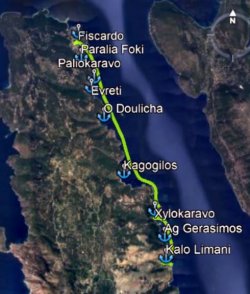 Toute la côte NE de Cephalonie, entre Fiscardo et Ag Eufemia, offre une série de mouillages forains dans des criques bien indentées. Ils sont nombreux, pas tous accessibles, mais bien protégés des vents dominants de NW. Les fonds descendent très vite, obligeant à passer des amarres à terre. Sauf pour les criques proches de Fiscardo, elles sont généralement désertes, avec deux exceptions : Kalo Limani et Kakongilo, sur cette dernière, une ferme marine gâche un peu le paysage. Pour le reste la hauteur des montagnes, râpées et minérales, contrastant avec les vallées profondes et ombragées descendant jusque aux criques, donnent un aspect sauvage à un paysage millénaire, juste gâché par des essaims de guêpes, pas vraiment partageuses...