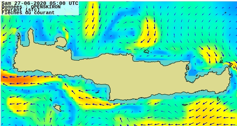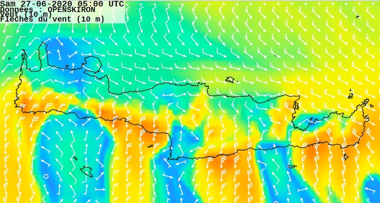 - Et en contournant les deux extrémités Ouest et Est des accélérations importantes de la force du vent qui s’orientent vers le sud à l’ouest et le SE à l’est sous l’influence du canal de Karpathos