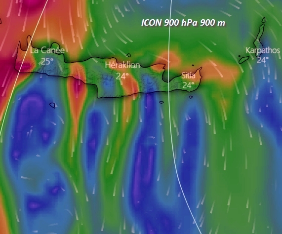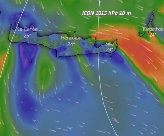 Sur une longueur de 150 milles, orientée W=>E , la Crète et ses hauteurs à plus de 2.400 m barre la route au Meltem. Trois grandes vallée complètement traversantes modifieront le comportement du Meltem, sous le vent de l’île