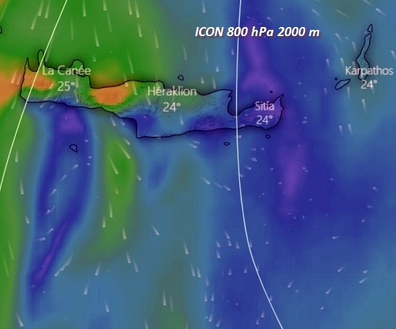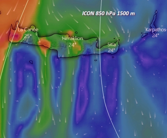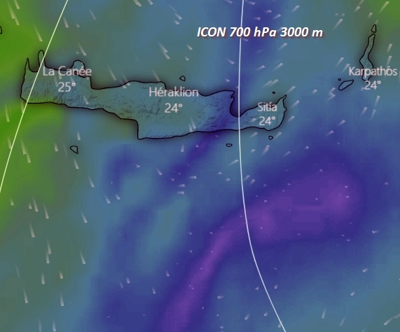 - Par soucis de présentation, le Meltem sur ce schéma frappe la Crète de plein nord. En réalité il il souffle du NW au nord de l’île, puis, canalisé par les vallées s’oriente N=>S en se renforçant