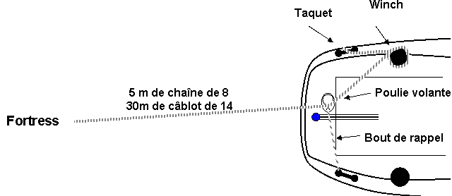 Il existe une alternative aux efforts considérables à mettre en œuvre : utiliser les winchs du bord, en complément d’une poulie volante ouvrables, qui retiendra le câblot dans l’axe. L’utilisation d’une ancre légère de type Fortress est recommandée. 30 mètres de câblot suffiront dans la majorité des cas. Prévoir plus long selon la spécificité des mouillages.