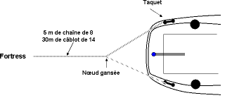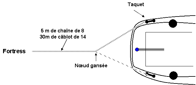 - Si le bateau n’est pas pré équipé d’un système de mouillage en poupe (guindeau + baille de mouillage AR + davier dans l’axe), le risque de se mettre en travers avant que le mouillage ne soit raidi, est grand.