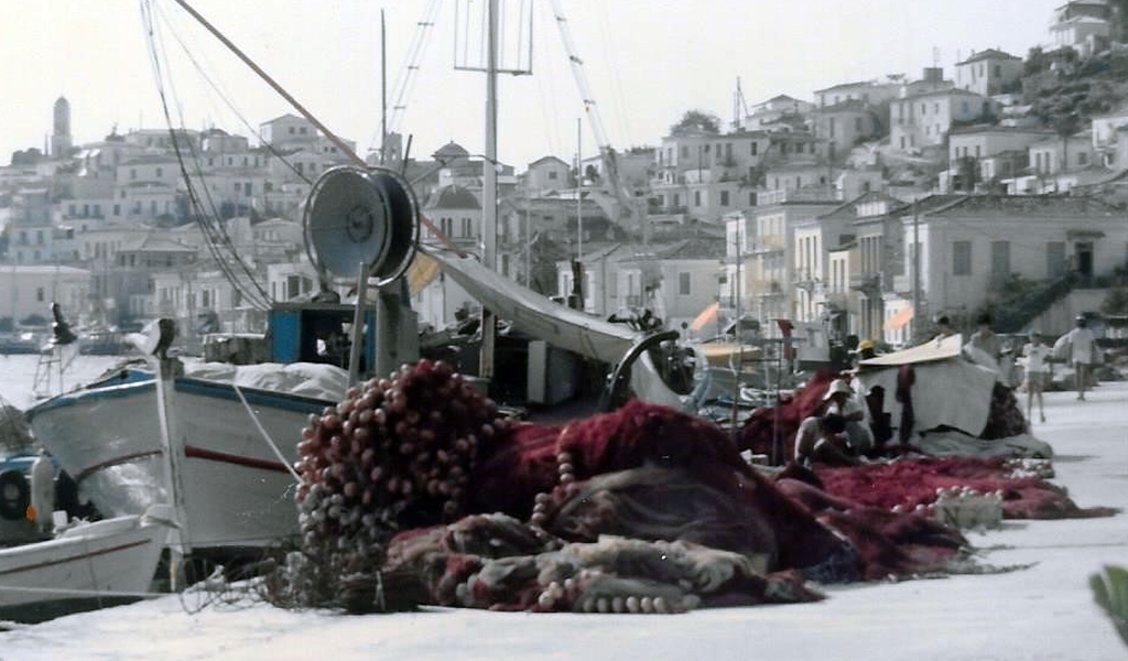 - Passant entre les dents rocheuses sentinelles du sud-est de l’Argolide, nous sommes allés à Poros. De gros pêcheurs encombraient les quais de leurs filets violets. L’île étant un peu en dehors des circuits touristiques était peu fréquentée, nous étions le seul yacht.