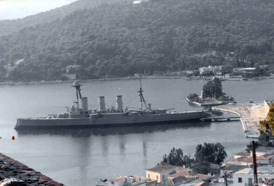 - Un vieux cuirassé l’ « Averoff » datant peut-être de 1914 était mouillé en face des quais de l’arsenal.