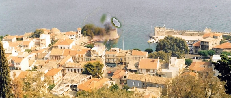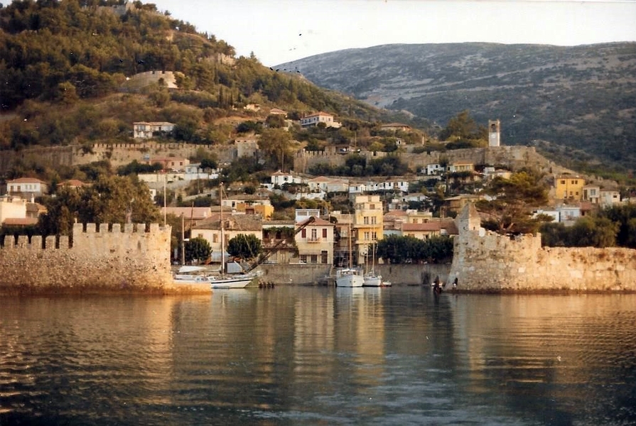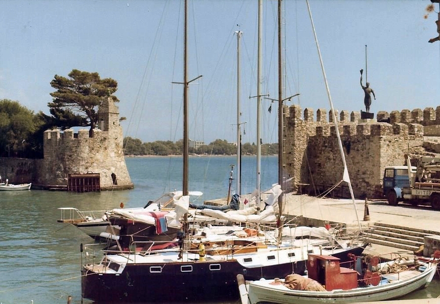- Après un mouillage dans une anse abritée de l’île Trisonia, non loin du détroit de Rion fermant le golfe de Corinthe, on arriva au soleil couchant à Naupactos (Lépante), non sans avoir tiré des bords contre un vent d’Ouest... en plein de face,