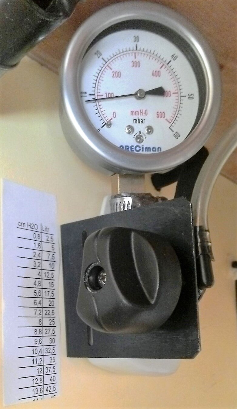 - Vanne en position gauche, la pression s’établit dans le tube relié à la cuve. On lit la pression sur le manomètre. Si on reste dans cette position, il est possible de faire une lecture en continu, par exemple lors du remplissage.